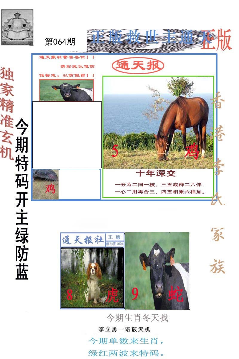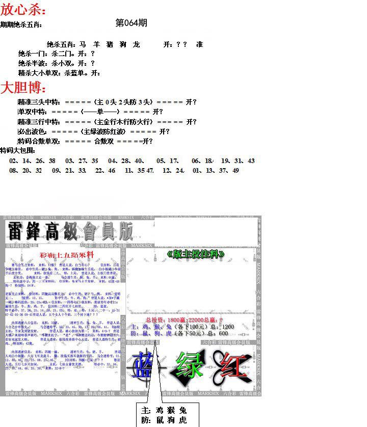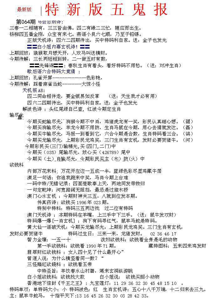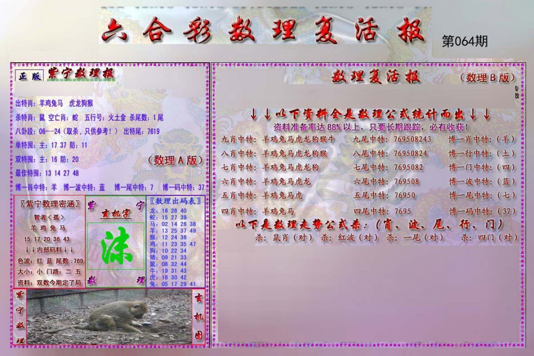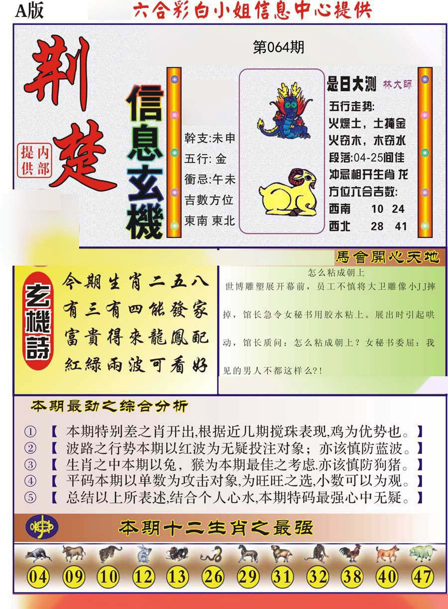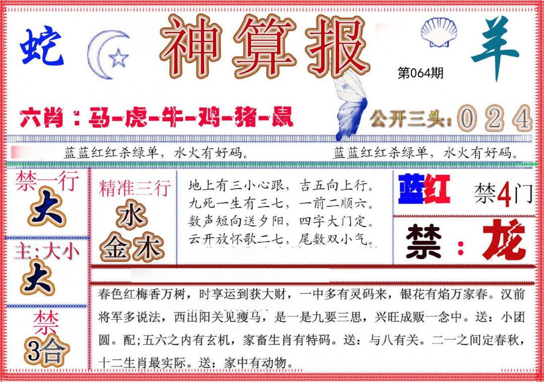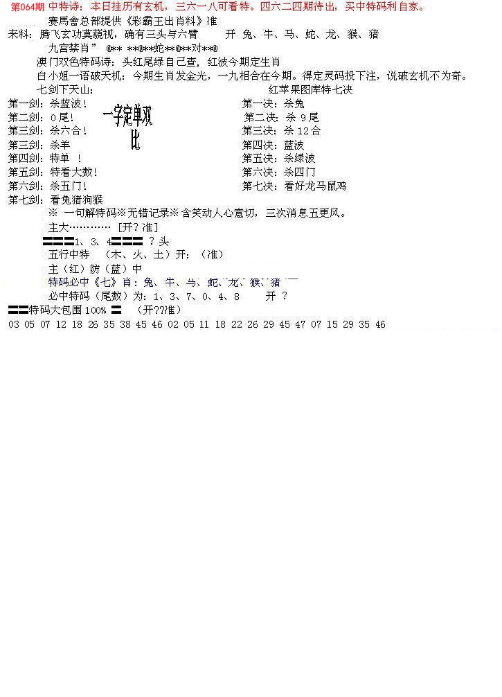 | 064期五肖:鼠蛇鸡兔狗 | 五码:43.02.10.28.21 |