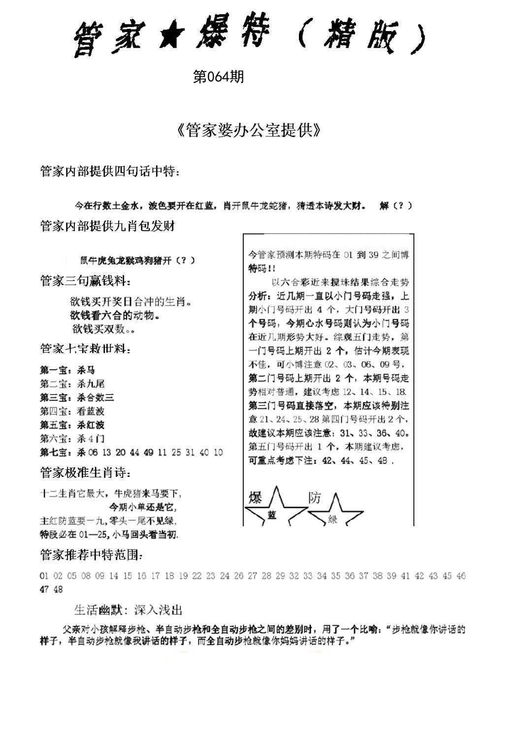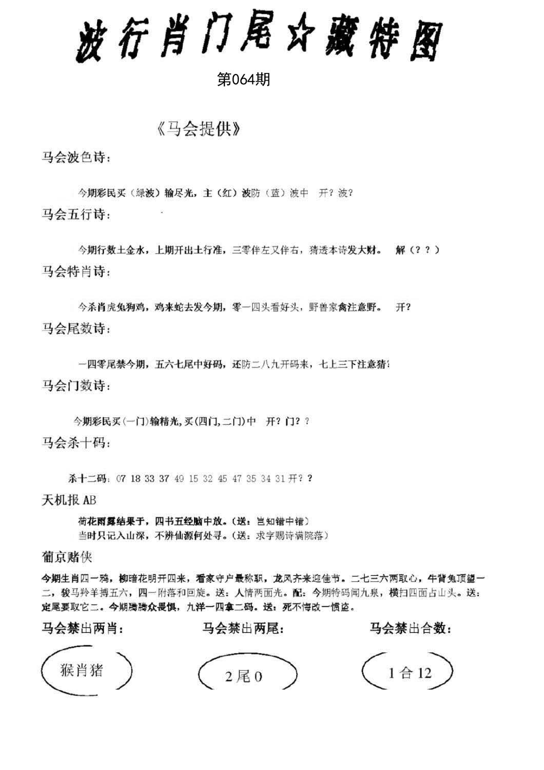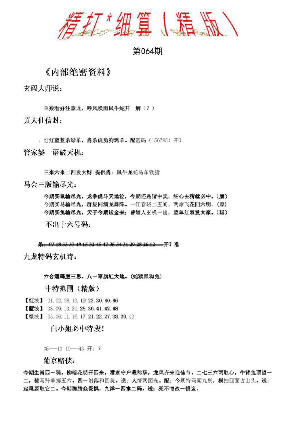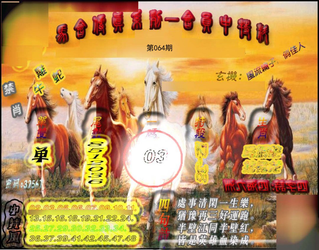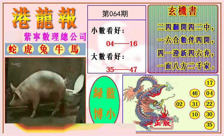 | 064期五肖:鼠蛇鸡兔狗 | 五码:43.02.10.28.21 |